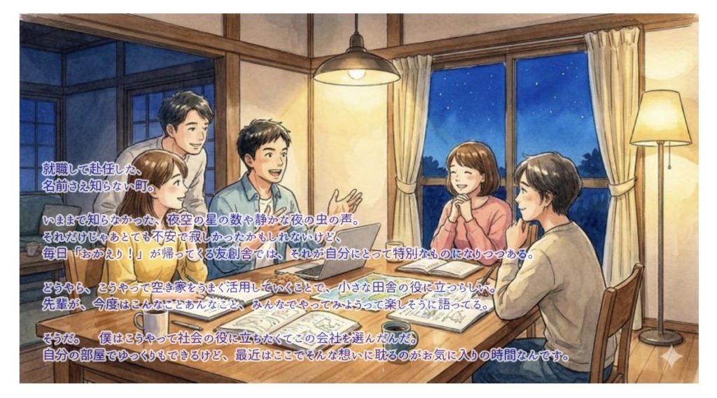 管理を完全に空き家番に任せる完全サービス付きのシェアハウスから、空き家番の伴走を受けながら自分たちの暮らしを自分たちで創っていくカタチまで、あらゆるシーンを選択できるシェアハウスです。